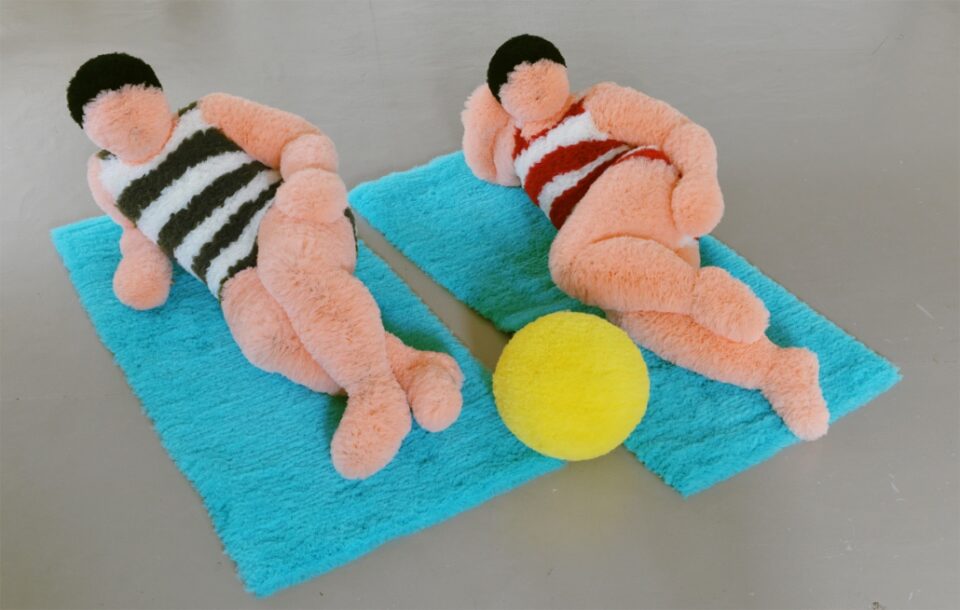 From Picasso to Léger, the theme of bathers has been a popular subject in modern painting. This performance offers a lively and whimsical adaptation, featuring a pair of doll-like performers in striped bathing suits—entirely crafted from pleated tulle—behaving as if they were spending a day at the beach. On a custom lawn installed on Madison Avenue for the day, they sunbathe, lounge, play, and engage in other classic bather activities, moving leisurely near two large blue towels and a yellow tulle ball, evoking a playful, almost childlike vision of the sea and sun. The audience follows the dolls as they wander and strike various poses. The performance evolves silently, continuously, adapting to the unique characteristics of each space and its possibilities for movement.